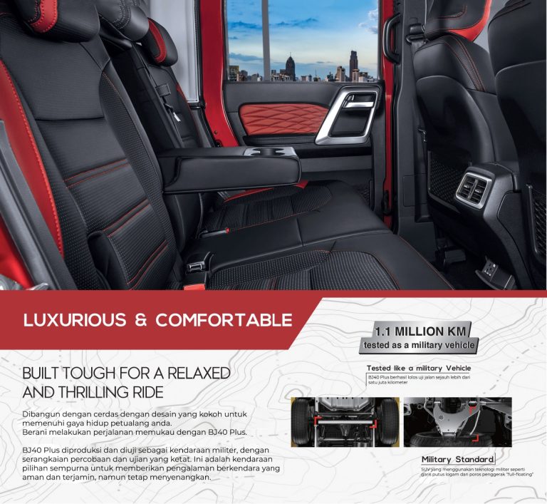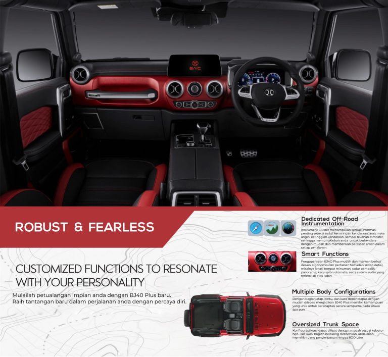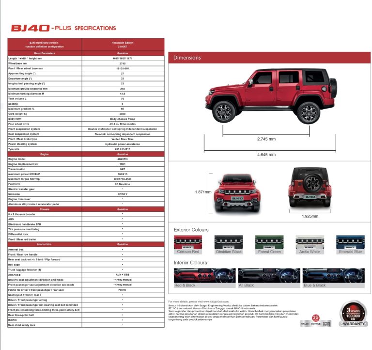 Secara dimensi, BJ40 Plus ini memiliki panjang keseluruhan 4.645 mm, lebarnya 1.925 mm, tinggi 1.871 mm, serta jarak sumbu rodanya 2.745 mm. Mobil ini dilengkapi dengan sistem pengereman ventilated disc dengan ABS dan EBD di bagian depan dan disc dengan ABS dan EBD di bagian belakang.